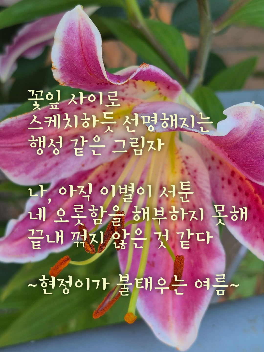 유체이탈 홍현정 하 0 146 0 2025.07.11 14:41 유체이탈月花 홍 현정검게 살갗을태우는 계절이 왔다쏟아붓는 불꽃을온몸에 분신하며 태양 속으로완벽한 도킹을 시도한다만족한 분리의 힘육체 밖의 세상을 맛보는허물 벗기로 새로운 누군가로세상에 던져질 때나는 비로소 탄복한다다시 돌아가도 나로 살고 싶다고 0